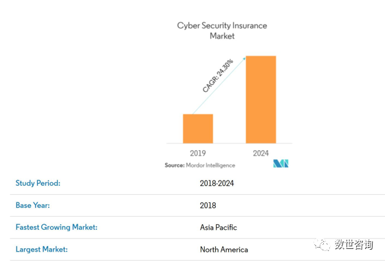 ✓由于遭遇网络攻击的不可避免性,网络安全保险业务开始明显提升。据Mordor Intelligence统计,2018年网络安全保险市场规模达到54.8亿美元,并在5年内保持24.3%的复合增长率,于2024年达到207.2亿美元的市场规模。