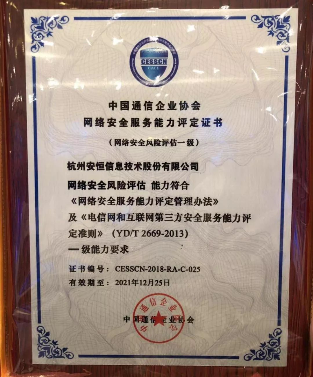 在2019年(第九届)电信和互联网行业网络安全年会上,安恒信息还取得了中国通信企业协会颁发的“网络安全风险评估一级”资质。此资质的取得无疑将进一步助推安恒信息在通信行业更好地开展网络安全风险评估工作。此外,安恒信息安服团队成员还获得了2018年度电信和互联网行业“网络安全优秀工作者”——“安全服务楷模”的称号。