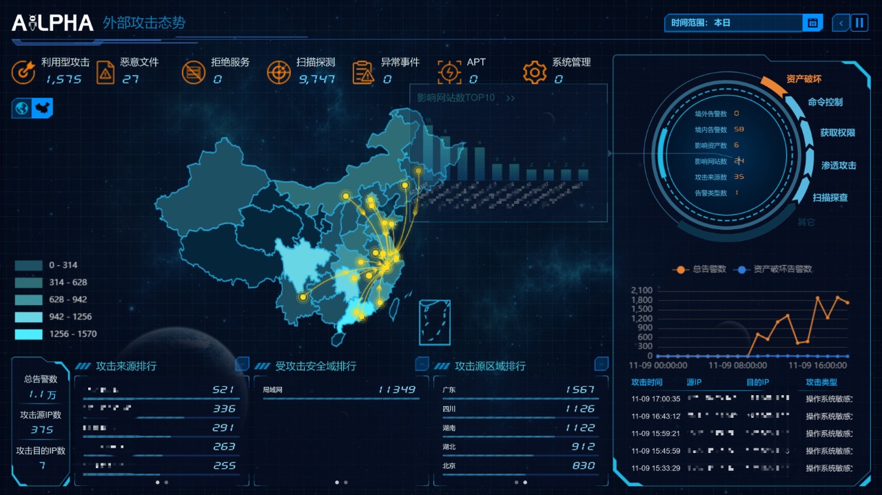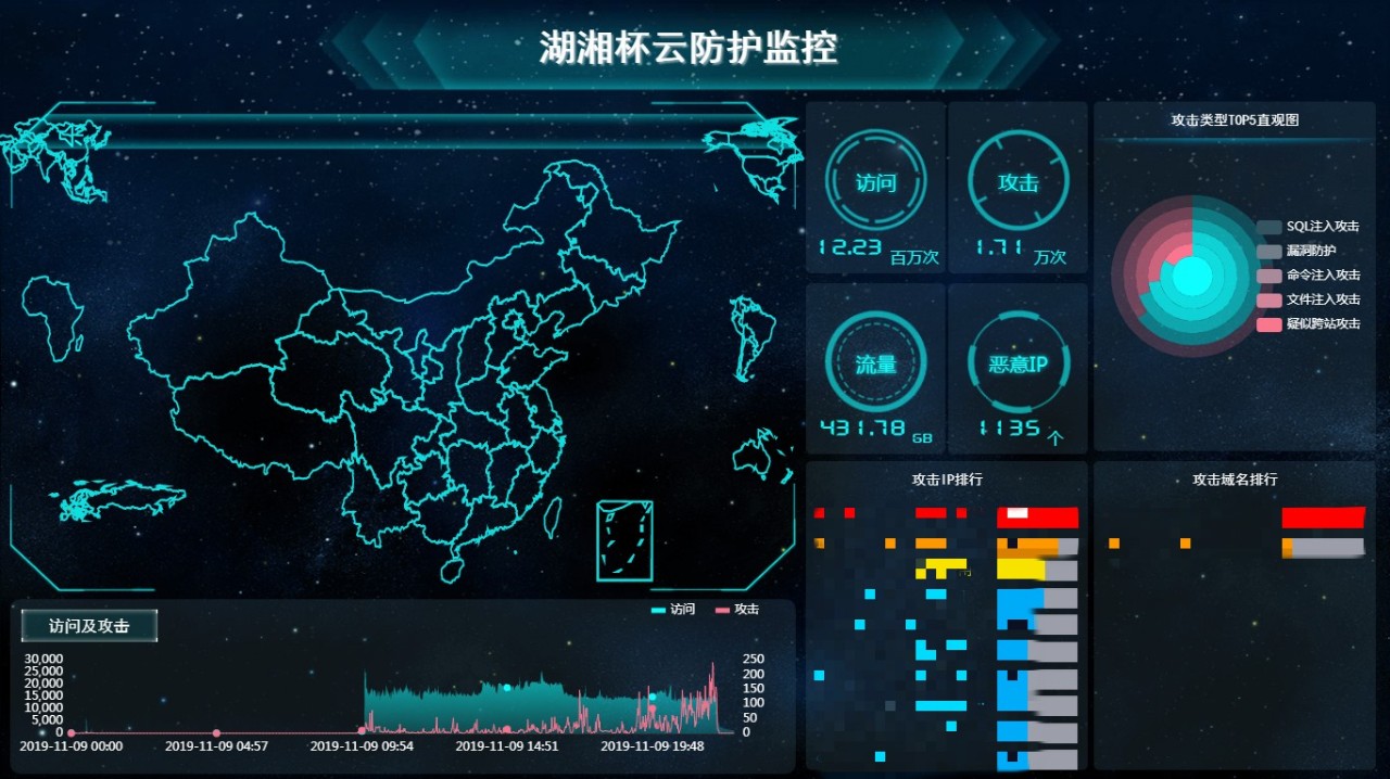 除提供强有力的在线竞赛平台外,保障竞赛平台的安全、高可用也非常重要。安恒信息启用了玄武盾保护竞赛平台,防止平台遭受攻击。截至9日晚22点比赛结束时,竞赛平台总访问量达1218万次,100%拦截攻击17000次,网站总流量达430.47GB,识别恶意IP1135个。攻击全天呈上升趋势,复赛结束前10分钟内达到顶峰。