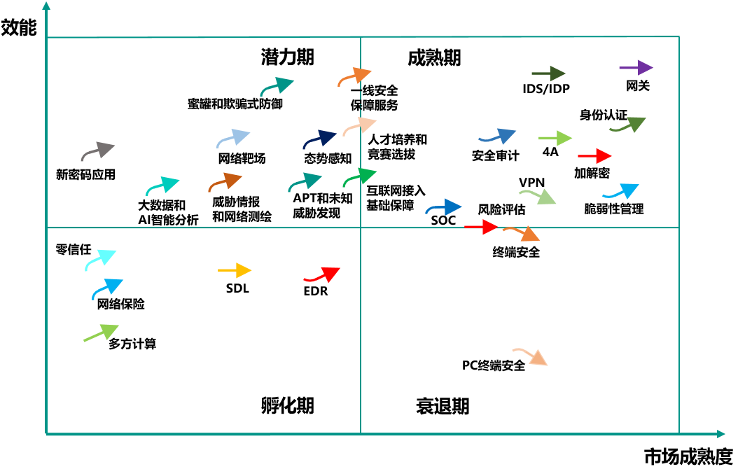 在蝌蚪图中,横轴代表市场成熟度,纵轴代表效能期望,每个蝌蚪指的是每个网络安全的细分方向,也即网络安全领域的重点技术和产品,而蝌蚪所指箭头则代表该方向未来发展的趋势。