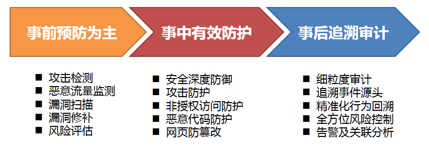 信息安全事件的发生,通常都会经历事前、事中、事后三个生命周期过程,不同的阶段我们可以有针对性地采用安全措施,三个生命周期的安全任务即事前预防为主、事中有效防护、事后追溯审计。