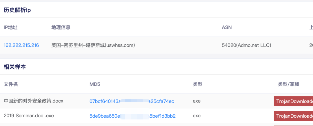 通过安恒文件威胁分析平台检索域名gongzuosousuo[.]net,又发现多个样本,其中2个样本引起我们注意: