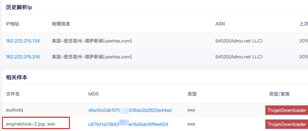 接下来,分析chm文件下载的ausetup.msi文件,它运行后也会释放叫“audiodq.exe”,其回连地址是:“lmhostsvc[.]net”,继续使用平台检索该域名,发现叫做engineblock-2.jpg.exe程序