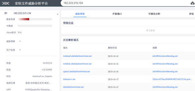 并且通过安恒文件威胁分析平台分析关联到另一个域名zhulidailiren4winnt[.]net也是主模块回连域名。