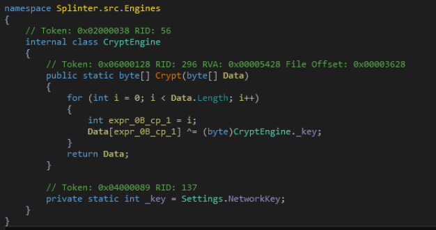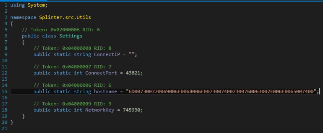 可以观察到网络连接的C2域名为mswinhostsvc[.]net,端口为 43821,被用于数据传输加解密的NetworkKey为745930。