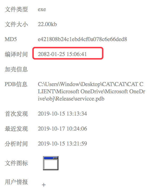 通过安恒文件威胁分析平台分析发现该样本的编译时间故意被篡改。