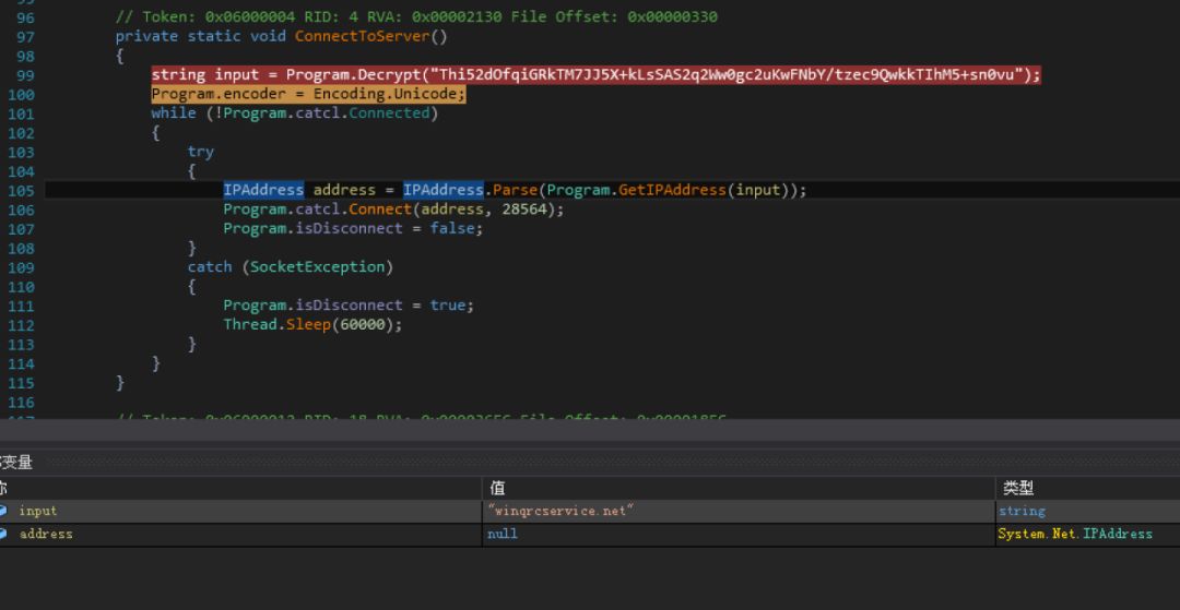 解密出远程服务器地址为winqrcservice[.]net,端口为28564。