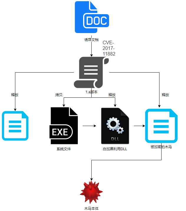 1、诱饵文档使用CVE-2017-11882执行释放到%temp%路径下1.a脚本;