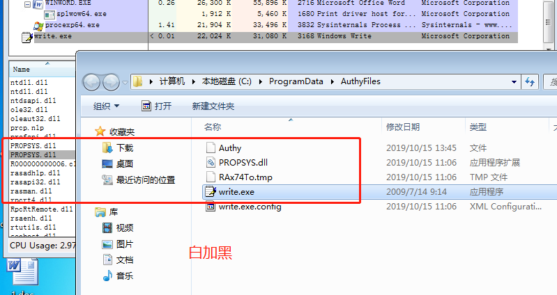 write.exe会加载同目录下的PROPSYS.dll实现白加黑利用