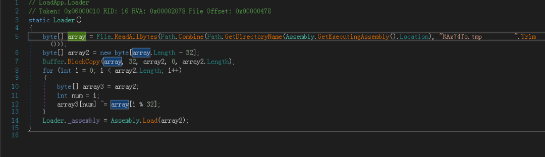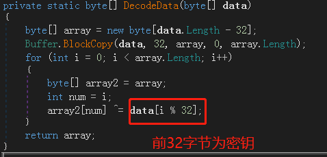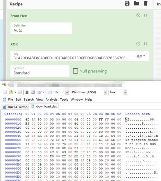 .tmp文件前32字节为密钥,后续字节通过异或解密,解密后确为一个PE格式文件