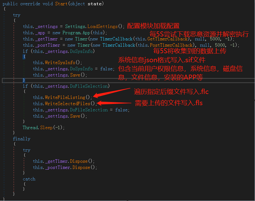 样本主体是一个C#窃密木马,名称SystemApp.dll,窃密木马整体流程为加载配置、启动信息收集和下载执行线程、进行一次基本信息收集: