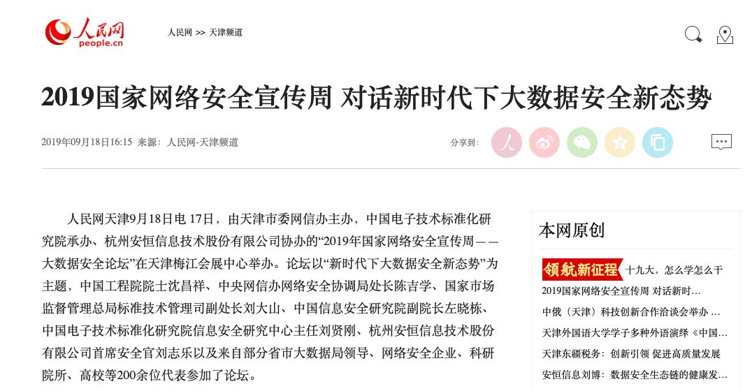 在天津举行的国家网络安全宣传周期间,浙江省政协常委、安恒信息董事长范渊表示,大数据已经成为国家的基础战略性资源,全面实施大数据发展行动,加快推动数据共享,助力产业升级与社会治理创新,已成为的国家战略。