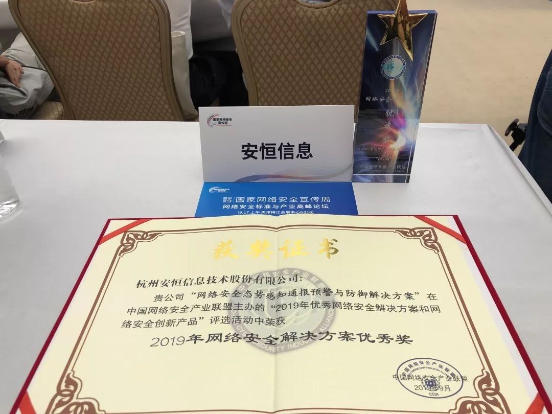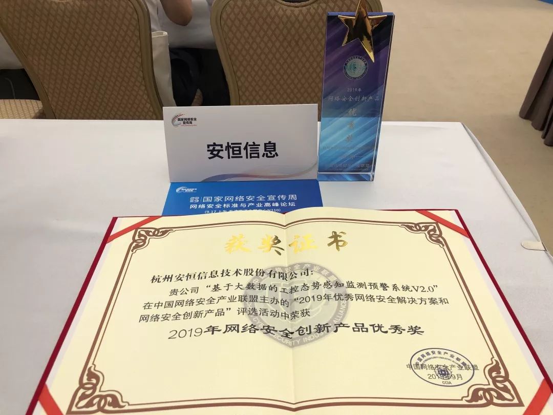 在今天的网络安全标准与产业高峰论坛上,安恒信息“基于大数据的工控态势感知监测预警系统V2.0”、“网络安全态势感知通报预警与防御解决方案”分别荣获由中国网络安全产业联盟所颁发的“2019年网络安全创新产品优秀奖”、“2019年网络安全解决方案优秀奖”,安恒信息首席安全官刘志乐代表公司上台领奖。