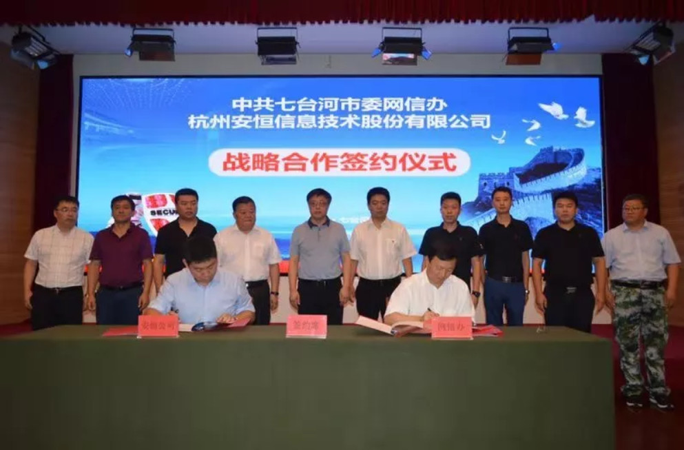 8月21日,在七台河市委常委、宣传部部长王义光,七台河市委网信办、公安局等十余家网信委主管领导的见证下,七台河市委网信办与安恒信息签订战略合作框架协议。