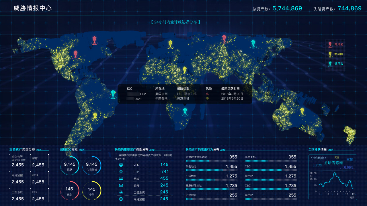 安全数据大脑的全网快速探测能力,能够在2小时内完成全球42亿IP资产探测,综合情报数据,分析全球的网络安全态势。安全数据大脑的数据治理体系涵盖了资产基础数据、威胁隐患数据和安全事件数据,更具完整性和系统性。