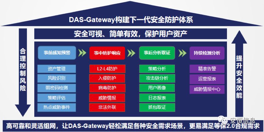 事前感知预警 -> 事中防护响应 -> 事后分析取证溯源,并持续检测分析,帮助企业大幅度降低安全事件产生的不良影响。