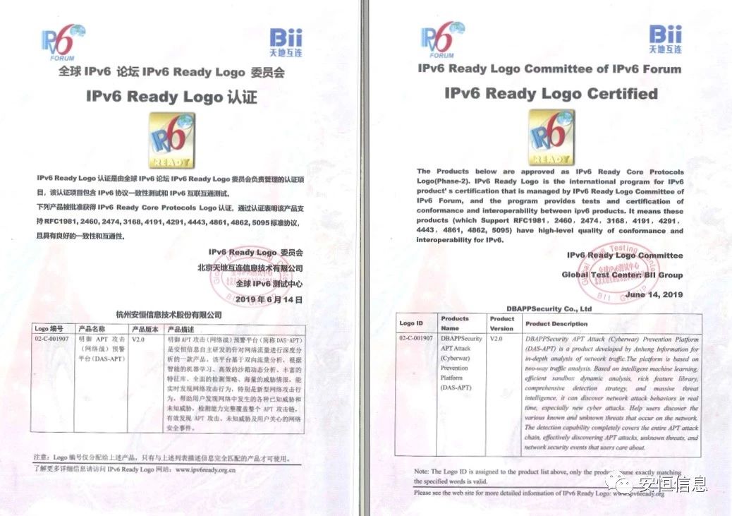 官宣!安恒信息明御APT攻击(网络战)预警平台正式通过IPv6 Ready Logo认证