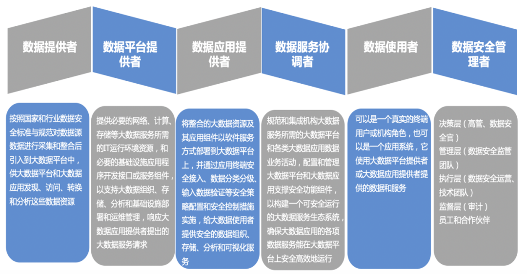 明确数据安全建设职责,安全不是一个部门的事情,明确好数据提供者、数据平台提供者、数据使用者、数据安全管理者等多角色,充分调用各个角色参与到数据安全的建设工作中,建立共建共治的协同管理能力。