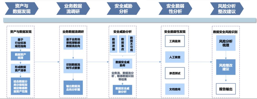 基于数字化业务的数据体量大,且数据敏感程度较高,风险不可知等特点,所以开展数据安全建设的首要工作是让风险可知。从合规视角和风险视角开展数据安全风险评估,以“数据”为核心梳理数据业务流和数据流,基于数据流通的业务场景,识别关键节点的数据安全风险,基于风险评估的结果进行数据安全体系化规划,此路径经实践较为科学,可操作性强。