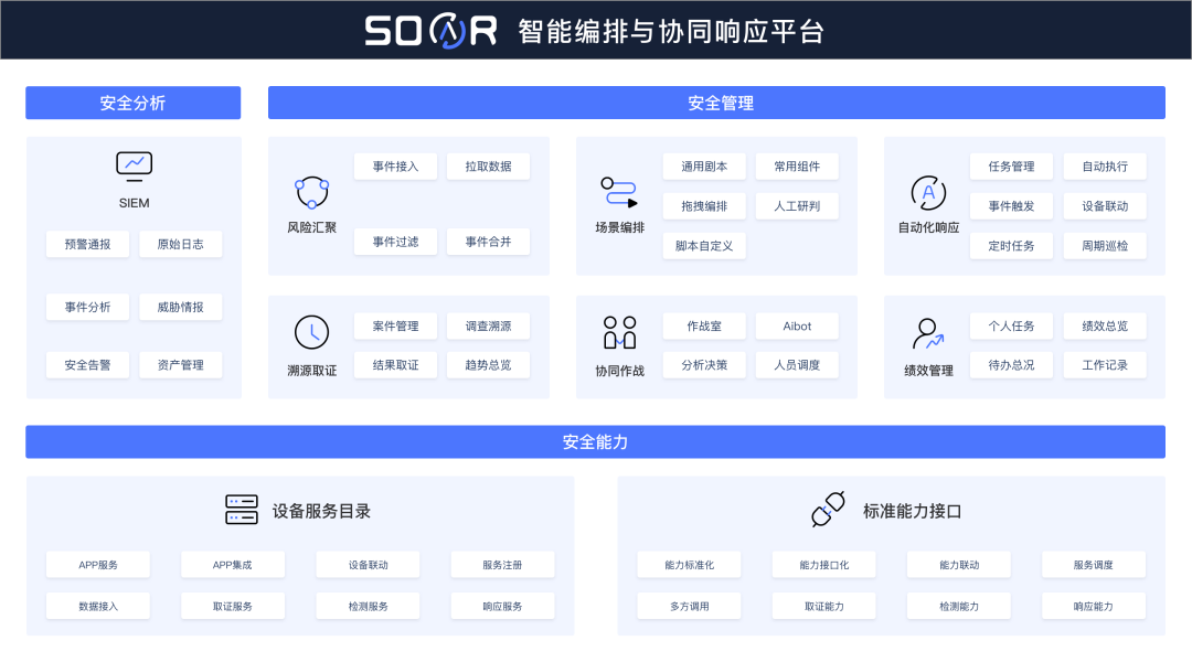 DASCA安全能力中心整合了平台主要管理设备能力、标准能力、剧本能力的注册和提供标准化API入口,并对接AiLPHA态势感知平台,可提供服务调度、服务注册(设备对接);剧本调用,实现安全设备统一管理,安全流程处置闭环。通过SOAR剧本编排、设备联动等自动化处置功能,极大地提升了安全运营的效率。目前,平台已经在政府、金融、运营商等多个行业获得广泛认可。