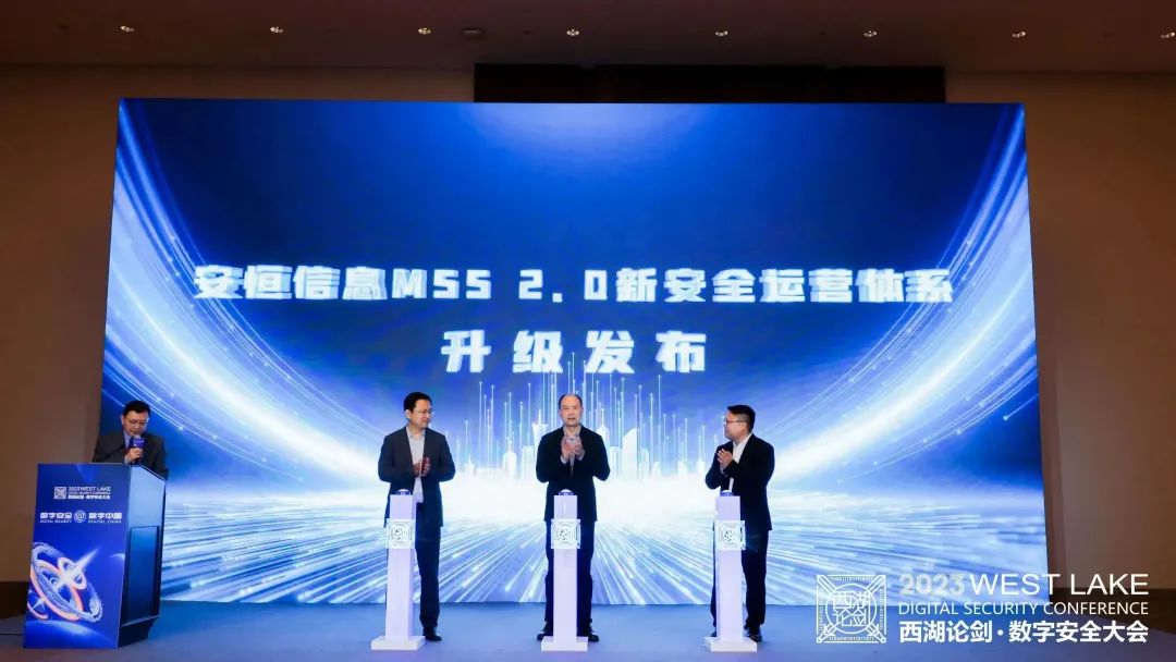 MSS安全托管运营服务今年迎来了新的规划与愿景。论坛上,宋皆荣、王军民、袁明坤上台共同发布“安恒信息MSS 2.0新安全运营体系”。