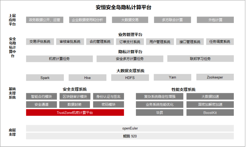 安恒Ailand安全岛隐私计算平台基于鲲鹏BoostKit提供的硬件机密计算功能所构建的安全支撑系统,通过支持TrustZone技术给程序和数据提供安全的执行环境;