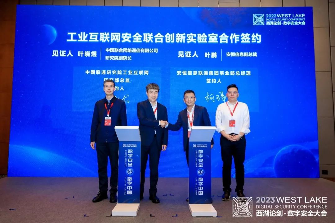 近日,中国联合通信有限公司研究院(以下简称“中国联通研究院”)与安恒信息宣布共同组建工业互联网安全联合创新实验室。在中国联通研究院副院长叶晓煜和安恒信息副总裁叶鹏的见证下,中国联通研究院工业互联网研究部总监周晓龙和安恒信息联通集团事业部总经理柯玮作为双方代表进行签约,就共同建立工业互联网安全联合创新实验室达成协议。