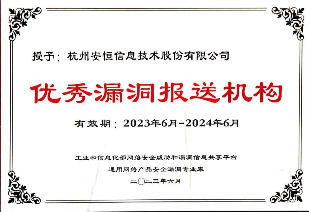 近日,中国信通院发布工业和信息化部网络安全威胁和漏洞信息共享平台(NVDB)通用网络产品安全漏洞库技术支撑单位等系列奖项。安恒信息凭借对漏洞报送工作以及漏洞治理等相关工作的大力支持,获得“优秀漏洞报送机构”、“优秀漏洞合作治理单位”两项荣誉。