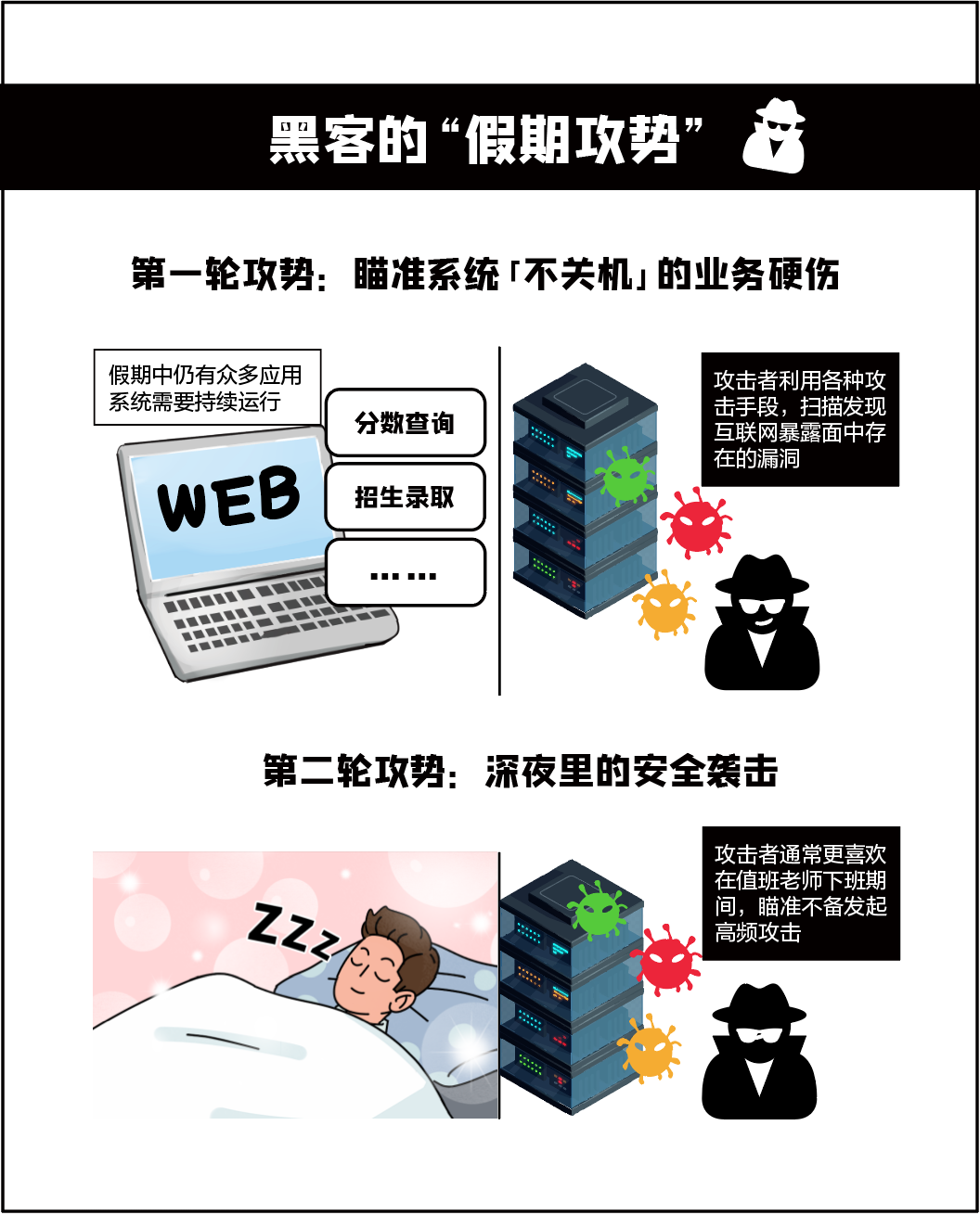 暑期终于到来了,伴随着师生陆续离校,黑客又要开始蠢蠢欲动,攻击者往往会在假期网络安全防守薄弱时发动“假期攻势”,提高入侵成功率。
