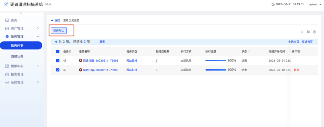 明鉴漏洞扫描系统提供同一任务任意两次扫描结果及两个不同任务扫描结果的对比分析,对比分析报告中直观展示任务漏洞个数差异、新增漏洞、减少漏洞等维度对比信息,快速排查整改情况,提升漏洞风险闭环处置的效率。