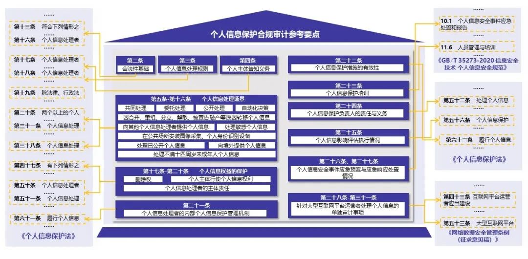 如上图不难看出,《要点》中相关参考条例与《个人信息保护法》《网络数据安全管理条例(征求意见稿)》《GB/T 35273-2020 信息安全技术 个人信息安全规范》中相关要求均有对比映射关系,从不同条款中都与现存的国家法律法规、标准要求进行了衔接,为个人信息保护合规审计国家层面的标准要求落点提供了细化补充与深度扩展。