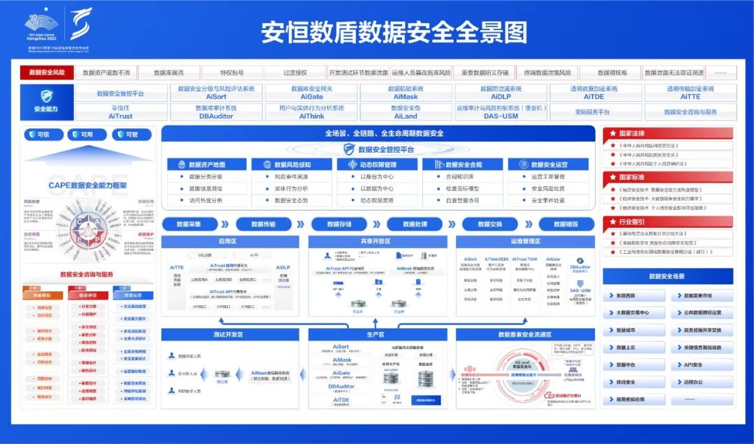 为保证数据安全流通,安恒信息提供安恒数盾数据安全解决方案,聚焦于身份安全、数据流通、数据保护、咨询规划四个方向,建立数据风险核查、数据梳理、数据保护、监控预警的CAPE数据安全能力模型,提供加密、脱敏、审计、识别等多版块安全保障能力。对于数据交易、数据开放等不可控环境的场景,安恒信息提供了原始数据不可见、计算模型授权可控的隐私计算方案,实现“数据价值传递”、“数据可用不可见”、“数据可用不可取”。同时,安恒信息提供了咨询前期数据安全顶层规划、咨询中期数据安全治理落地、咨询后期数据安全持续运营的闭环服务。