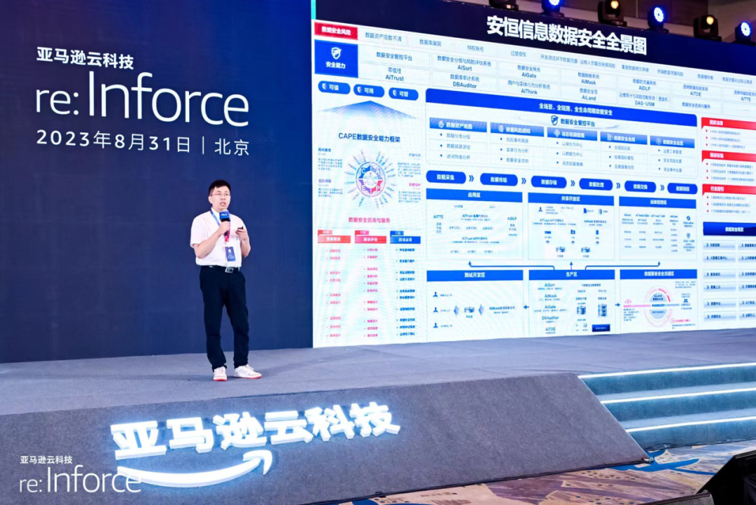 同时,安恒信息在主会场上展示了与亚马逊云科技的合作成果——云原生AiSort数据安全分级与风险评估系统。安恒信息数据安全专家莫凡,在会场上向观众们展示了云原生Aisort的核心功能和优势。
