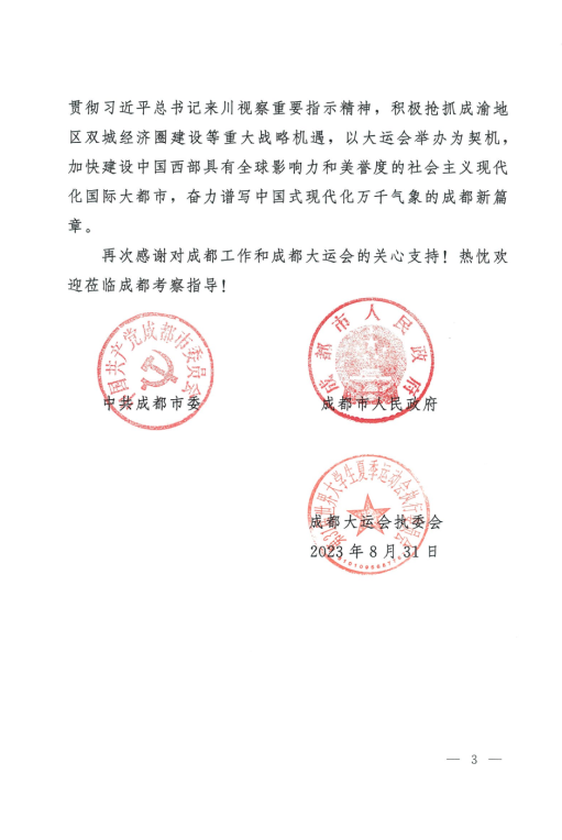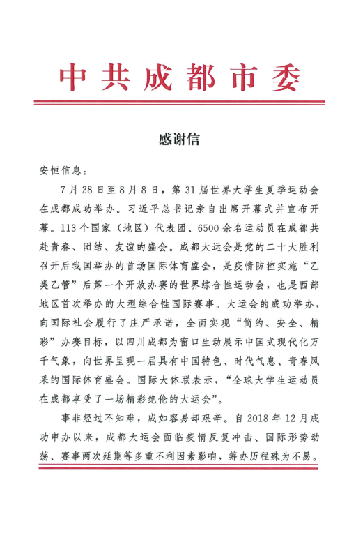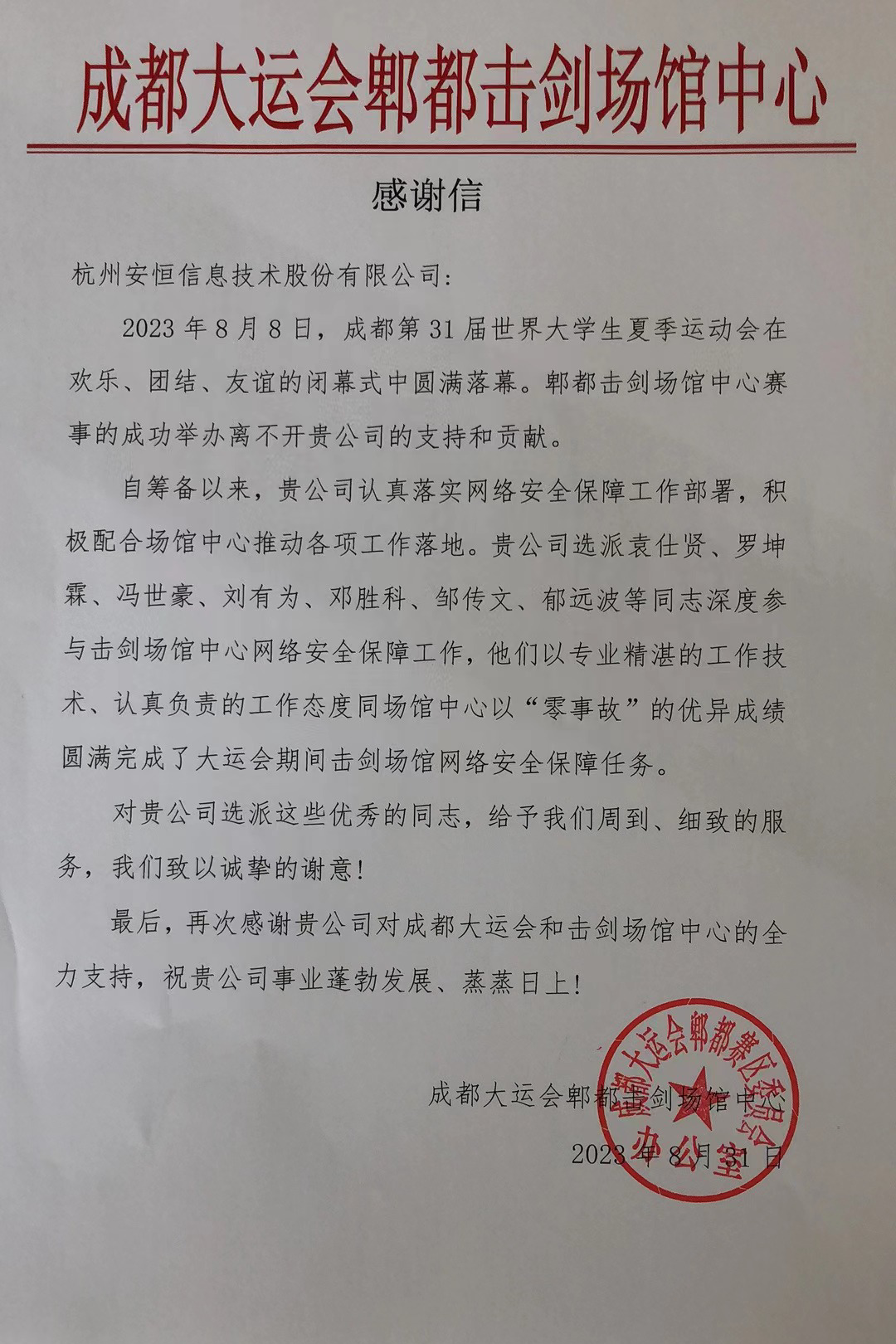 在成都市委市政府及成都大运会执委会感谢信中,对于此次安恒信息在成都大运会以赛谋城、网络安全保障、市场开发、品牌传播等角度给予高度评价,并期待“作为‘赛事名城合伙人’之一,在成都未来的国际赛事中看到安恒信息的身影。”
