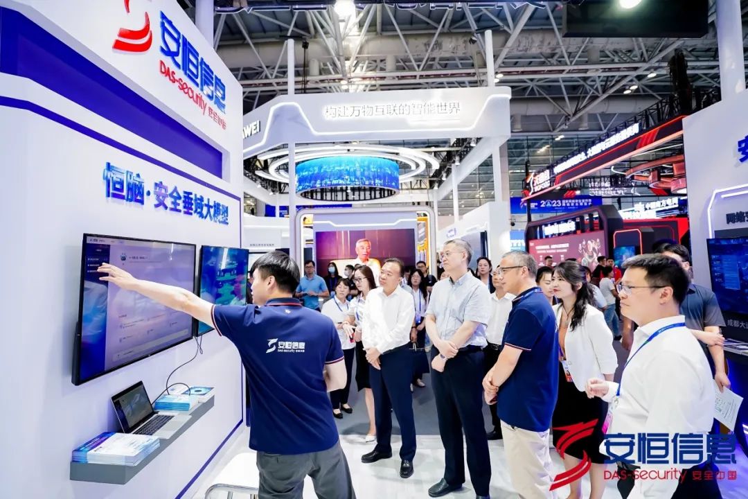 中央网信办领导、福建省委宣传部领导一行莅临安恒信息展位,聆听了天穹新一代主动防御安全运营中心和恒脑·安全垂域大模型的介绍。