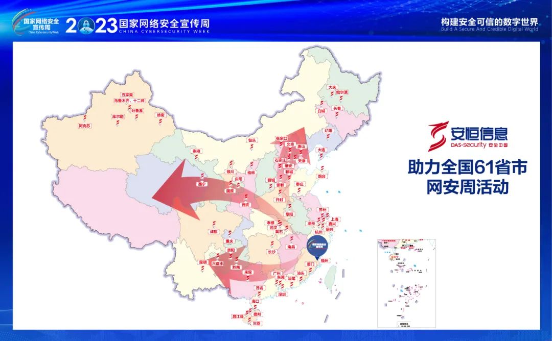 2022年网安周期间,安恒信息以合肥带动全国29城联动,举办各类网络安全宣传活动,今年再度升级。2023年网安周期间,除福州外,在广东广州、河南开封、陕西榆林、雄安新区等61个省市,安恒信息通过展览、科普互动、主题分享、研讨等方式,为普及网络安全知识、提升网络安全意识做出贡献。