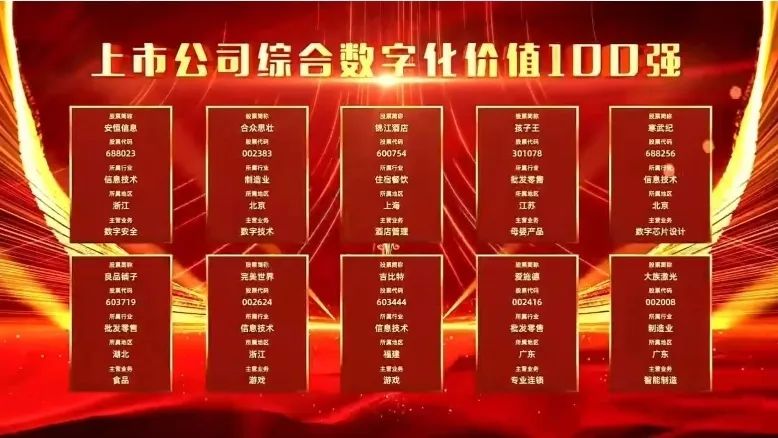在颁奖环节,安恒信息成功入围2023年上市公司综合数字化价值百强名单,2023年上市公司数字安全数字化价值TOP20名单两大榜单。在这份榜单的入围,是对安恒信息多年以来持续持续深耕数字安全领域,聚焦前沿科技研发,提升核心竞争力的有力展现。