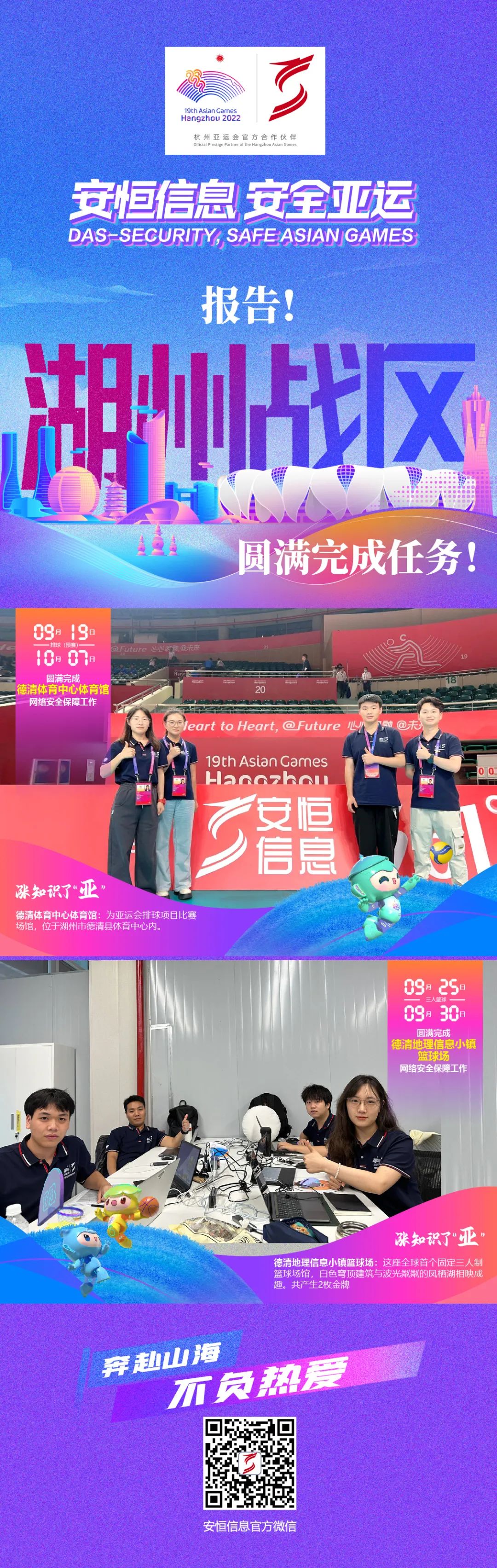 随着本届亚运会步入尾声,安恒信息六大主战区中,继温州、宁波之后,金华、绍兴、湖州三大主战区也陆续完成网络安全保障任务,画上圆满句点。至此,除即将举办闭幕式的主办城市杭州外,其余五大战区已全面告捷!
