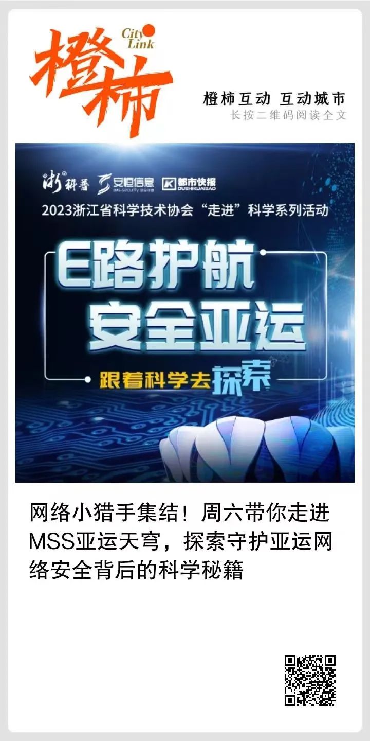 这个周六,机会来了!“浙”里网络小猎手快快集结!浙江省科协联合都市快报推出的科学走进活动,这次将带领大家走进杭州亚运会官方网络安全服务合作伙伴安恒信息,跟着浙里科普,一起了解“网安神器”,感受“智能亚运”,助力提高全民网络安全意识,为数字中国安全保驾护航。