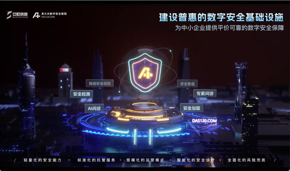 安恒信息云产品线常务副总裁叶章龙介绍到,“A大夫数字安全医院”是安恒信息针对中小企业研发和建设的普惠数字安全基础设施。“A大夫”依托安恒AI大模型和SaaS化的安全能力,同时配合数字安全保险,降低企业数字安全建设成本,兜底企业数字安全风险,以“医疗+医保”的方式向客户提供全生命周期的数字安全保障。