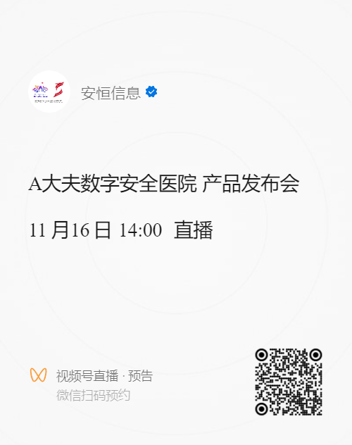 11月8日,由中国网络空间安全协会主持的新产品新技术在乌镇互联网国际会展中心成功举办。会上,安恒信息正式发布“A大夫数字安全医院”全新产品。