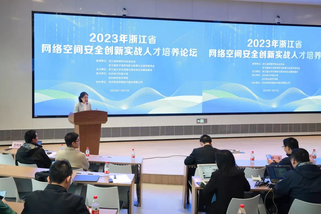 为了进一步加快推进全省网络安全人才实战化培养,构建多元化人才培养体系,本届大赛同期举办了首届浙江省网络空间安全创新实战人才培养论坛,邀请了浙江省公安厅、知名高校、优秀网信企业等众多网络安全领域的专家、学者,围绕高质量创新实战网络空间安全人才培养、课程建设、课程思政、产学研协同育人等主题,开展了深入的交流与研讨,共同为网络安全实战人才培养献计献策。