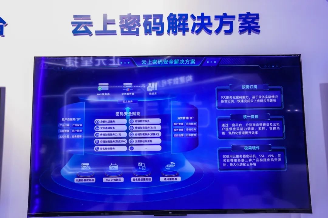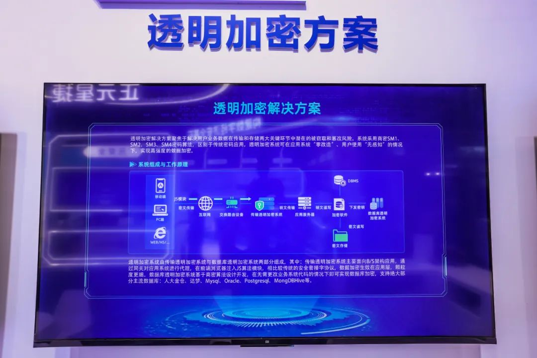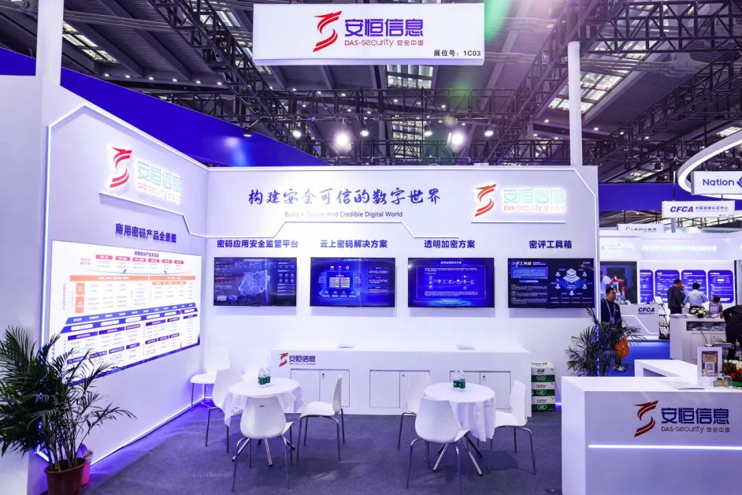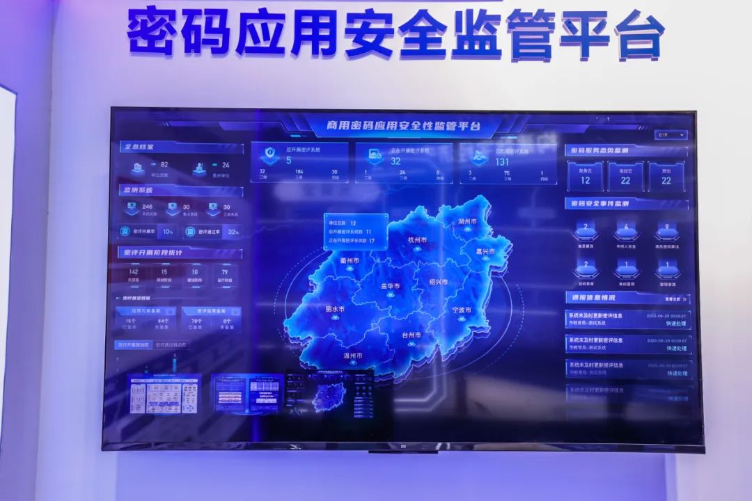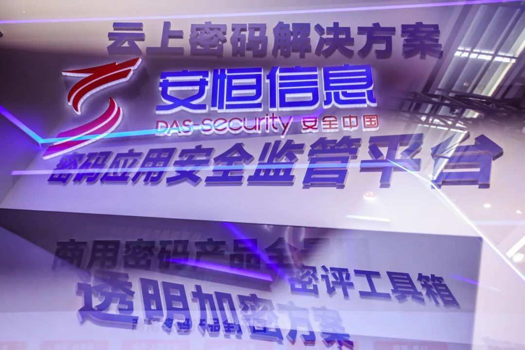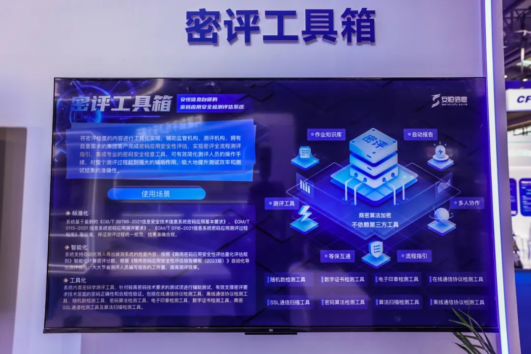 现场,安恒信息展示了密码应用安全监管平台、云上密码解决方案、透明加密方案、密评工具箱等商用密码产品与解决方案,集中展示了安恒信息在商用密码应用建设与监管的科技成果。