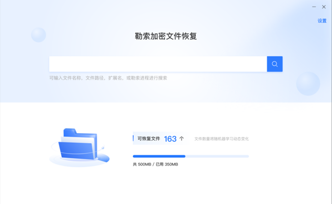 ■ 文件备份恢复:勒索软件试图加密某些文件时,勒索加密文件恢复驱动可以监控到该软件对文件的可疑修改操作,在勒索软件写入之前,抢先备份该文件。备份完成后,用户可使用安全工具中的勒索加密文件恢复功能,输入文件名称,文件路径,扩展名,或者被病毒查杀功能检出的勒索软件进程名,搜索出备份的文件,进而恢复原文件。