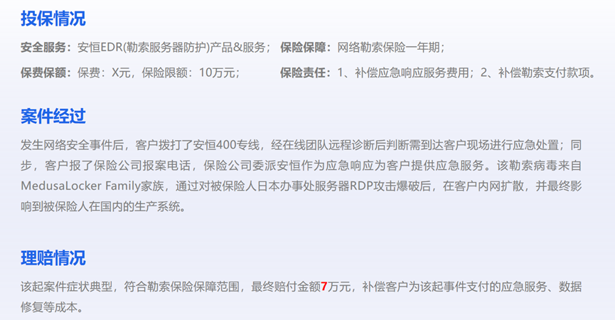 ■ 勒索保险:为了实现勒索防护强闭环,安恒推出勒索保险,从勒索防护到经济保障,帮助用户实现真正防护强闭环。安恒信息始终保持产品服务、人员服务、保险服务,通过真实案例,再一次证明:请把勒索防护交给安恒,安心留给自己!