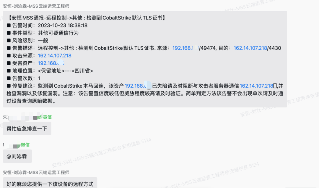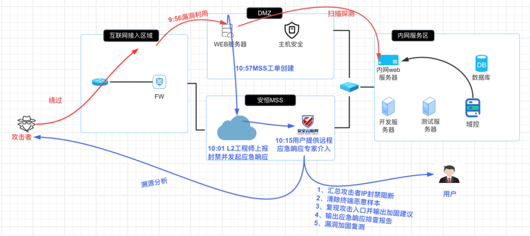 ③MSS服务人员确定资产已失陷,同步用户风险及时阻断并上报应急响应专家组为用户提供应急溯源分析;