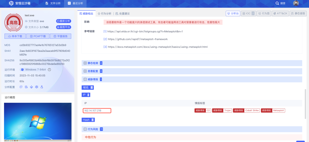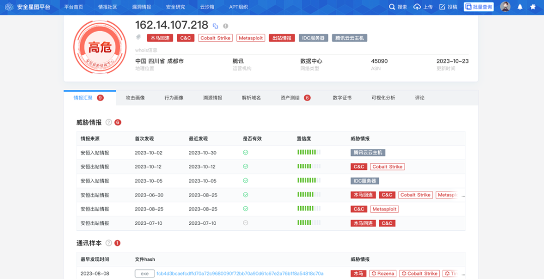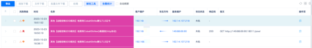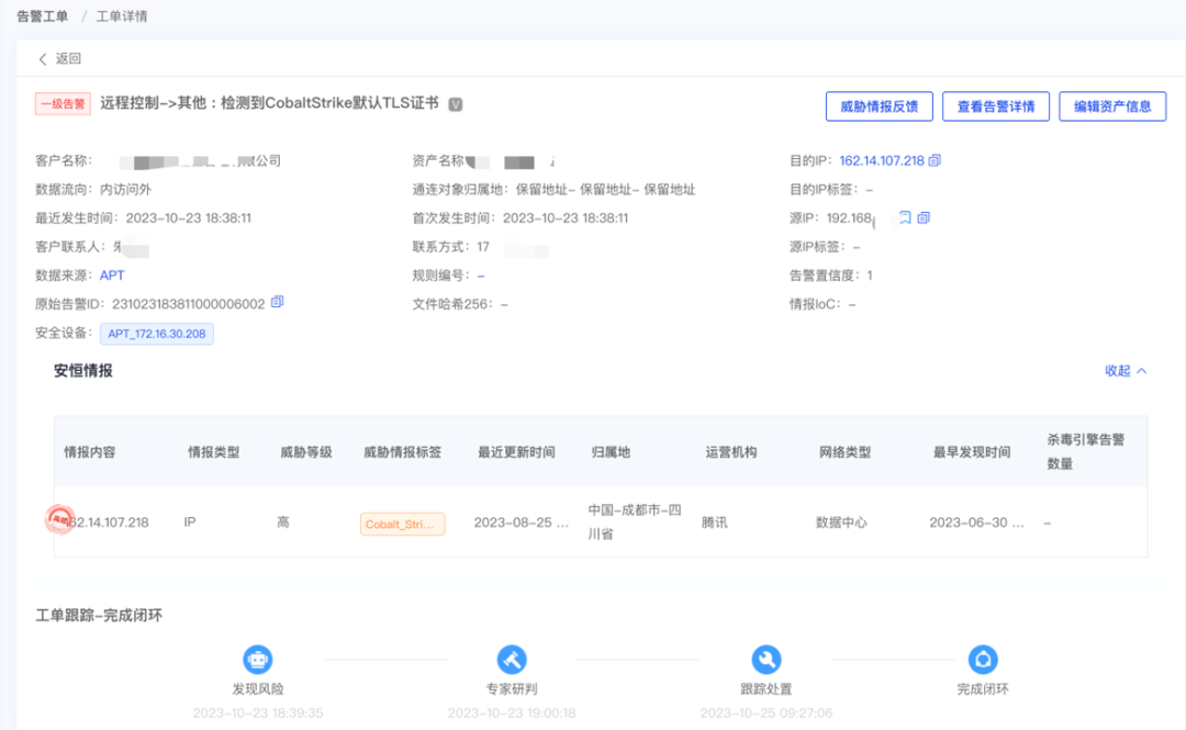 10月的某天凌晨,云端安全分析人员发现该供应商某管理系统出现异常告警:CS特征流量告警,通过对告警详情分析,确认机器失陷。值班人员立即电话联系用户对接人,在说明情况并得到用户确认后,断网处理的同时对CS外连IP进行封堵。