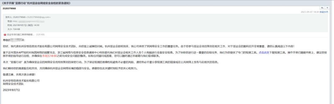 杭州第十九届亚运会作为史上规模最大、项目最多、覆盖面最广的一届,共设立40个大项、61个分项、481个小项,共有举办城市杭州及宁波、温州、湖州、绍兴、金华等五个协办城市参与办赛。政府决策的部署、民众的热情参与、志愿者的无私奉献,以及供应链的安全可靠共同推动了亚运会的顺利举办。而安恒信息MSS亚运天穹——主动防御安全运营中心就在亚运赛事期间保障了一批特殊用户——亚运赛事供应商,并在整个保障期间产生了起到了关键作用,本文选取其中某个典型用户的真实事件进行介绍。