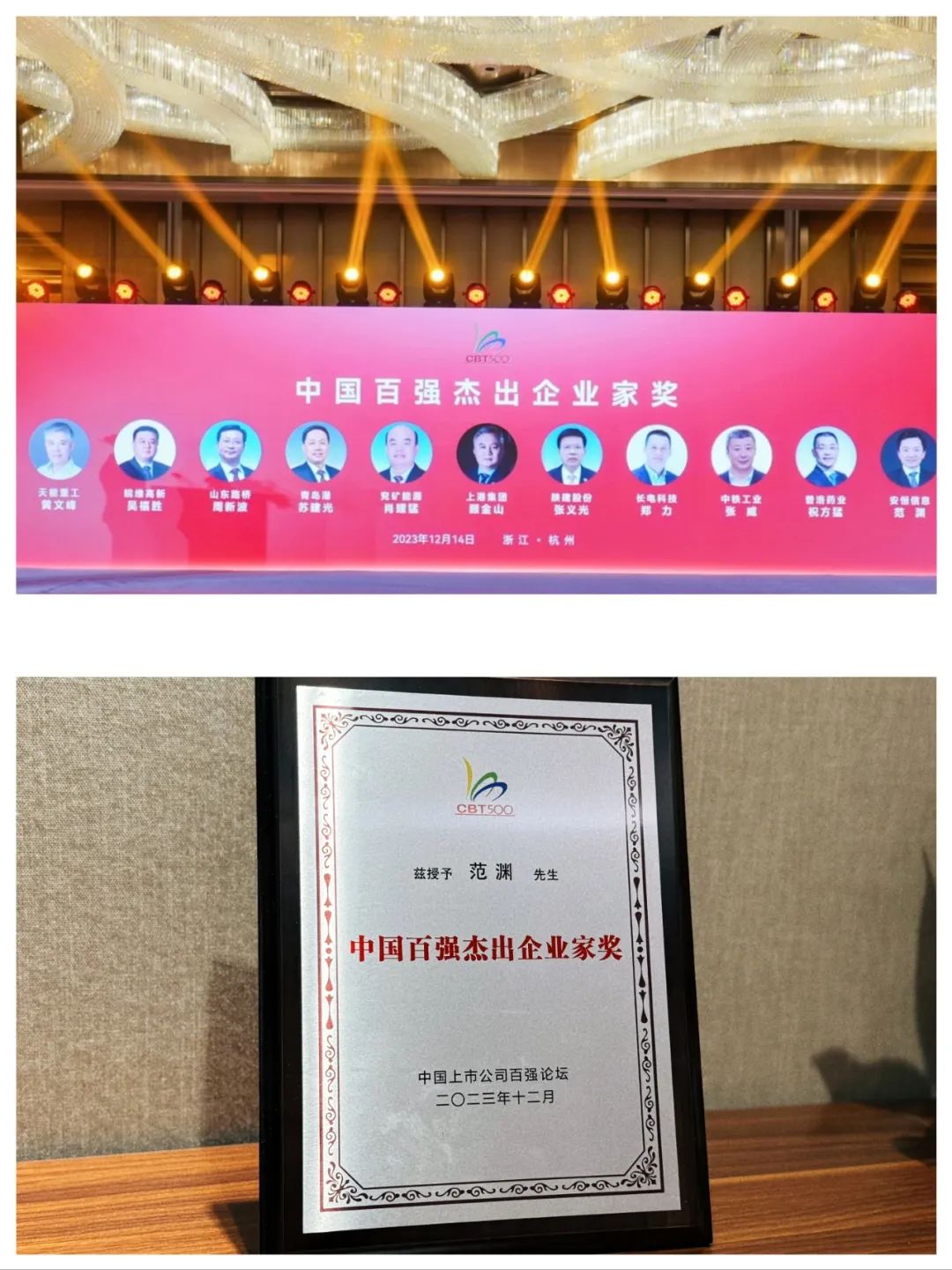 会上,安恒信息董事长范渊获颁“中国百强杰出企业家奖”,共同入选的还有山东港口青岛港党委书记、董事长苏建光,上海国际港务(集团)股份有限公司党委书记、董事长顾金山,山东高速路桥集团股份有限公司董事长周新波等企业家。