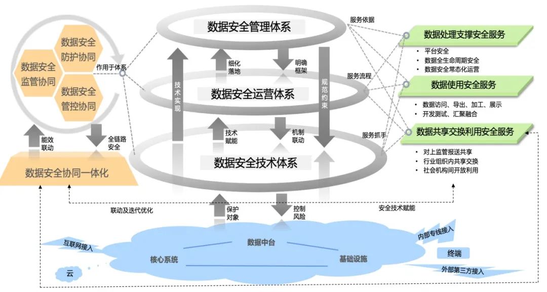 自数据安全体系化治理概念推出以来,安恒信息一直在实践中不断更新迭代方法论,从“前期-数据安全顶层规划、中期-数据安全治理落地、后期-数据安全持续运营”三段论中提炼出更具象化的、落地性质的咨询理念,围绕数据安全防护、管控、监管三大协同一体化机制,作用于数据安全管理、运营、技术三大体系架构,延伸出数据处理支撑、使用、共享交换利用三大安全服务领域,持续为客户提供管理抓手、技术赋能、运营联动,保障全链路全场景的数据安全。